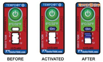 TempDot™Plus標簽應存儲在室溫下,,并必須在反應溫度閾值以上被激活。激活是通過用手指推壓。"On"字出現在第一個窗口中顯示激活。之后5分 鐘內,,在反應溫度或低于反應溫度的情況下將標簽貼到產品上。藍色染料熔化并以控制的速率遷移,經過白色大窗口。這表示暴露在溫度閾值以上的累計時間。當溫 度低于閾值時,,該染料固化并停止移動。如果溫度超過閾值,,TempDot®Plus標簽提供即時的視覺跡象。
