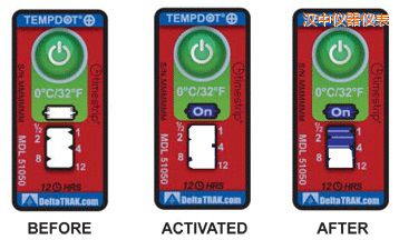 TempDot™Plus標(biāo)簽應(yīng)存儲在室溫下,并必須在反應(yīng)溫度閾值以上被激活。激活是通過用手指推壓。"On"字出現(xiàn)在第一個(gè)窗口中顯示激活。之后5分 鐘內(nèi),在反應(yīng)溫度或低于反應(yīng)溫度的情況下將標(biāo)簽貼到產(chǎn)品上。藍(lán)色染料熔化并以控制的速率遷移,經(jīng)過白色大窗口。這表示暴露在溫度閾值以上的累計(jì)時(shí)間。當(dāng)溫 度低于閾值時(shí),該染料固化并停止移動。如果溫度超過閾值,TempDot®Plus標(biāo)簽提供即時(shí)的視覺跡象。