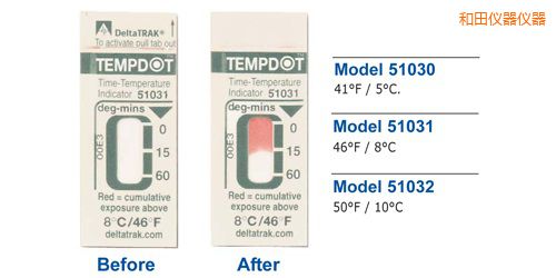 DeltaTrak提供滿足你各種需要的標(biāo)簽:WarmMark溫度標(biāo)簽、高溫?zé)針?biāo)簽和TempDot時(shí)間溫度指示標(biāo)簽顯示溫度變 化超過(guò)預(yù)設(shè)的時(shí)間。FreezeCheck和ColdMark溫度標(biāo)簽用于顯示運(yùn)輸溫度低于0℃。商業(yè)洗碗機(jī)使用的TempDot高溫?zé)針?biāo)簽可顯示最終沖 洗水溫是否達(dá)到71℃(HACCP體系所要求的溫度)。 TempDot時(shí)間溫度標(biāo)簽,型號(hào)51030-51032,,是一種低成本的標(biāo)簽,可顯示溫度高于閾值長(zhǎng)達(dá)60分鐘。當(dāng)溫度超過(guò)臨界值,,標(biāo)簽顏色變化開(kāi)始,但溫度下降到閾值之下時(shí),標(biāo)簽顏色變化停止,如此來(lái)顯示累積溫度超過(guò)的時(shí)間-,對(duì)于許多質(zhì)保應(yīng)用來(lái)說(shuō),度分鐘是非常的重要的概念。有三種溫度閾值5℃、8℃和10℃可供選擇。 這個(gè)低成本標(biāo)簽可以指示一段長(zhǎng)到60分鐘暴露在臨界點(diǎn)溫度。