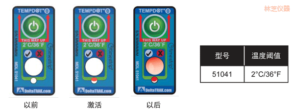 TempDot™ Minus標簽需存儲在室溫下,并且必須在反應(yīng)溫度 以上被激活。激活是通過用手指推壓,標簽 底部的小窗口變?yōu)榧t色或部分變紅色以指示激活,但激活后并不需要保持紅色。當使用了上述反應(yīng)溫度 標簽的產(chǎn)品暴露于閾值以下的溫度,白色的大窗口變?yōu)榧t色或部分紅色,在反應(yīng)溫度 以上將溫度標簽用 于產(chǎn)品。如果一個產(chǎn)品暴露于閾值以下的溫度,白色的大窗口變紅色或部分紅色,TempDot™ Minus標簽 提供即時的視覺指示。為達到最佳效果,標簽應(yīng)保持垂直位置,其反應(yīng)期間,紅色箭頭須指向上方。