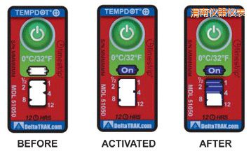 TempDot™Plus標簽應存儲在室溫下,并必須在反應溫度閾值以上被激活。激活是通過用手指推壓。"On"字出現(xiàn)在第一個窗口中顯示激活。之后5分 鐘內,在反應溫度或低于反應溫度的情況下將標簽貼到產(chǎn)品上。藍色染料熔化并以控制的速率遷移,,經(jīng)過白色大窗口。這表示暴露在溫度閾值以上的累計時間。當溫 度低于閾值時,該染料固化并停止移動。如果溫度超過閾值,,TempDot®Plus標簽提供即時的視覺跡象。