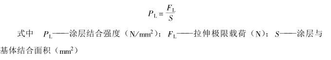涂層拉伸強(qiáng)度是涂層承受法線方向(垂直于涂層表面)拉伸應(yīng)力的極限能力,這是評定涂層結(jié)合力的最重要指標(biāo)。試驗中,利用試驗工具或設(shè)備使試樣承受垂直于涂層表面的拉伸力,直至試樣被拉開,即涂層剝離,記下破壞時的載荷,以試樣的斷面積除此載荷值,即可計算出涂層的拉伸強(qiáng)度。如下式: