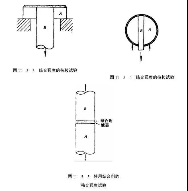 如圖11_5_5所示,對圓柱形試樣A的端面進(jìn)行粗糙處理后進(jìn)行噴涂,制成試驗所要求的涂層,涂層厚度依要求而定(最小厚度一般不小于0.4mm)。同時在同等材料和尺寸的圓柱形試樣g的端面進(jìn)行粗化處理,在試樣A的涂層面和9的粗化面上,各涂上一層薄而均勻的粘合劑,將試樣A置于試樣9上,使軸心重合,并加以適當(dāng)壓力使其充分粘合,勿使氣泡殘留在粘合劑中,溢出的粘合劑應(yīng)清除,待固化后進(jìn)行拉拔試驗。