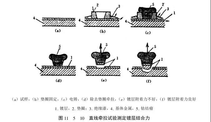直線章拉試驗可直接在鍍件上進(jìn)行。首先在試件鍍層表面,用一非導(dǎo)體墊國固定在被測部位上,并在墊國以外的鍍層表面加以絕緣層,然后在墊國以內(nèi)的鍍層上電鑄鈷或其它金屬,經(jīng)一定時間,在該鍍層上沿墊國內(nèi)壁形成一個金屬結(jié)瘤,電鑄結(jié)束后取下墊國,除去絕緣層,將鑄有金屬結(jié)瘤的試件置于專用的張力測試機(jī)上,以機(jī)械力將般層牽拉至斷裂見圖11_5_10。根據(jù)般層剝離時用力的大小及般層結(jié)合面積可計算出般層的結(jié)合強(qiáng)度。