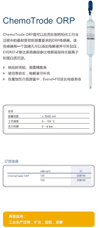 ChemoTrode ORP是可以應(yīng)用在制藥和化工行業(yè)過程中的最耐受苛刻測量要求的ORP傳感器。該傳感器有一個加液孔可以添加電解液并可外加壓,EVEREF-F參比系統(tǒng)確保參比電解液保持無銀離子和蛋白質(zhì)沉淀。